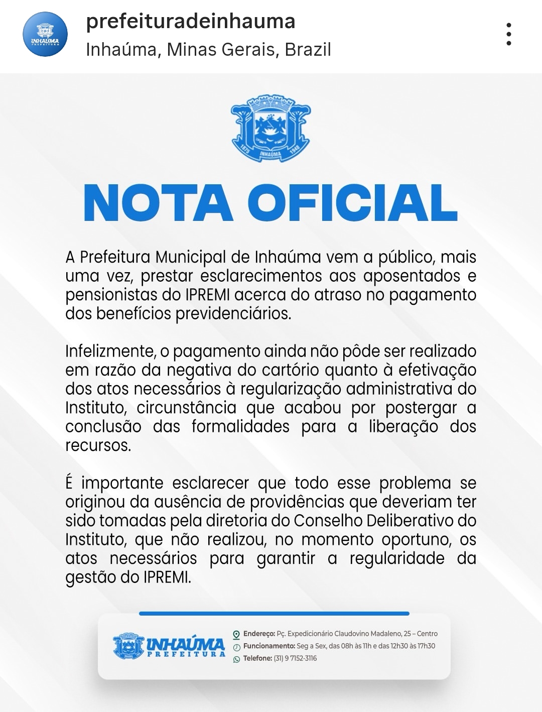 A Prefeitura Municipal de Inhaúma emitiu uma nota oficial atribuindo o atraso a problemas com o cartório e à falta de providências da diretoria do Conselho Deliberativo do Instituto. Para quem está sem um real no bolso, as explicações soam como desculpas vazias. Enquanto o governo municipal e o IPREMI trocam acusações de "irregularidade de gestão", o trabalhador é quem paga a conta.
